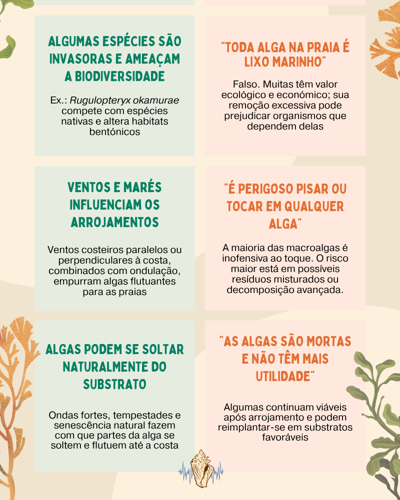 - Marés: O ciclo das marés influencia a linha de costa onde as algas são depositadas. Marés vivas (com maior amplitude) podem arrastar as algas para zonas mais elevadas do areal, enquanto marés mortas podem concentrá-las mais perto da linha de água.